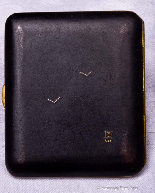 A signed early 1900s antique Damascene Shigarettokēsu Cigarette case featuring Mt Fuji. In the foreground small sailing boats glide between the legendary mountain and the famous Taisekiji Temple. Using quality elements the cigarette case has been beautifully detailed with K24 gold and Sterling Silver which is confirmed with the K24 stamp on the rear of the case. The gold signature appears to be G Sakata, Kobe.