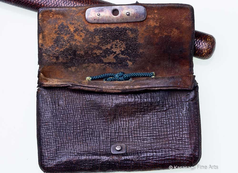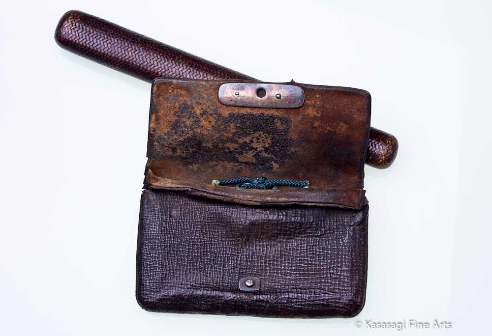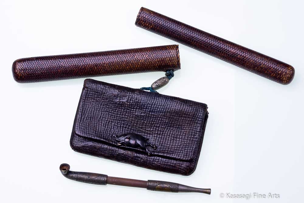 A Japanese deerskin Tabaka-Ire Tobacco Pouch estimated to be from late 1700s. and an intricately detailed Kiseruzutsu Pipe Case featuring a bamboo and brass Kiseru Pipe.