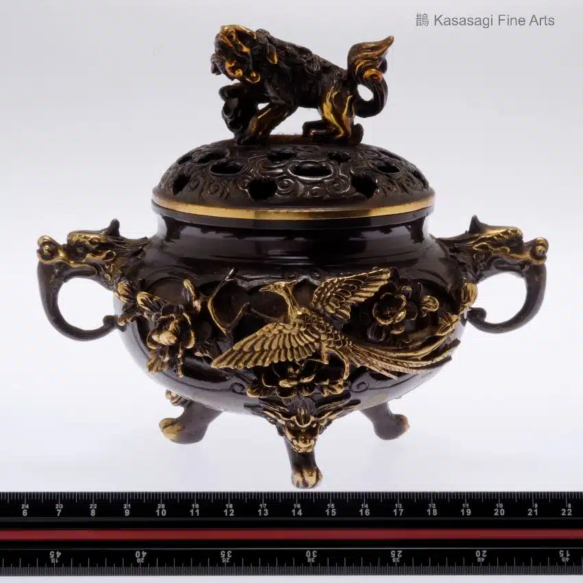 A very substantial and highly detailed Japanese Bronze Koro. Bearing the stamp of the makers mark on the base and standing on bronze tripod legs featuring dragons. Dragons also feature on the handles of the koro and phoenix and flowers surround the body of the koro. The perforated lid also has a Shi Shi lion seated on clouds on the finial. A very solid bronze Koro in very good condition.