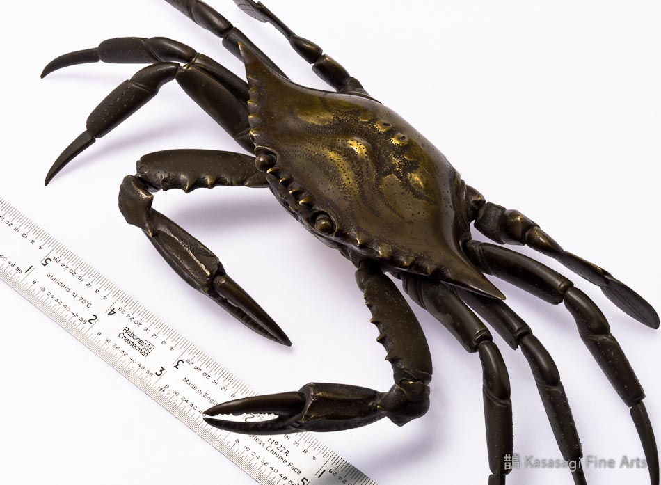 The crab has 32 fully moveable parts with all legs and claws as well as its eyes being articulated and able to be realistically moved. The Japanese call these objects Jizai Okimono 自在置物 which means ‘a freely moving image’. This is a very fine and very scarce, high quality craftsman made Bronze with a beautiful patina.