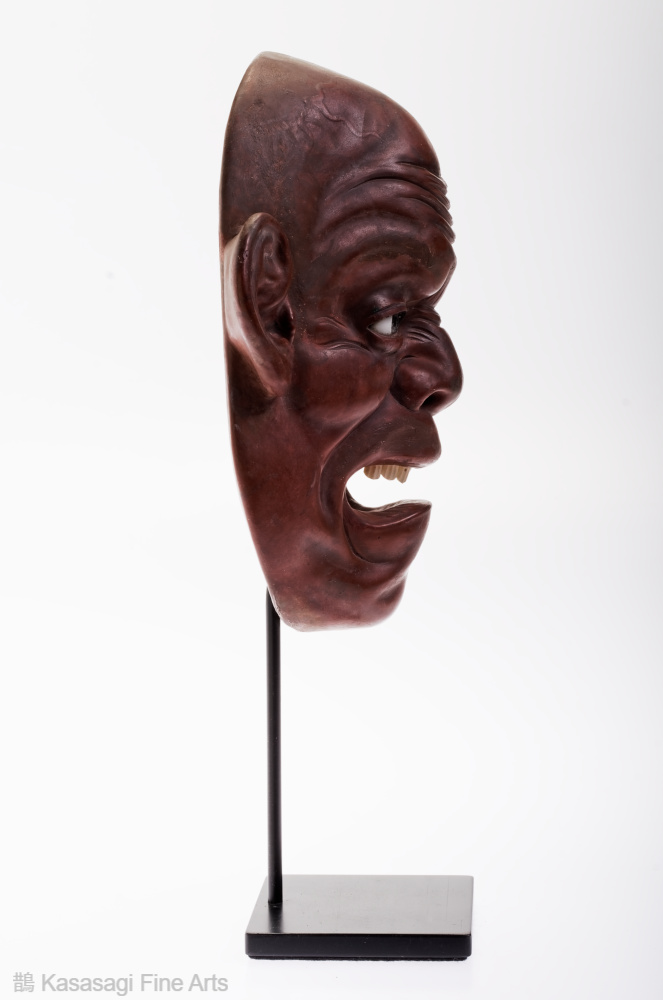 The “Kojo” mask is worn by the actor portraying the old man in the first part of “Takasago” and in other Noh plays. The mask, embodying dignity and divinity, foreshadows the old man’s appearance in the second part as a god. Noh Theatre grew in popularity during the Muromachi period (1336-1573) and is still performed today throughout Japan.