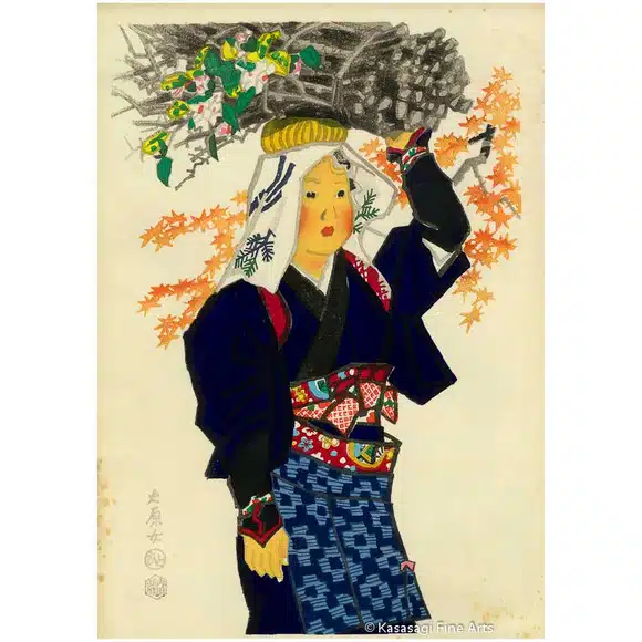 Eiichi Kotozuka Original woodblock print titled Oharama Girl is a colourful original depiction of women peddlers from the Heian period to the Meiji period. The Oharama Girl peddles small items from the village of Ohara such as firewood, flowers, and agricultural products. Engraved and printed by Uchida Woodblock Printing Company in the 1950s with the Uchida seal and the seal of Kotozuka. There is some foxing which can be seen in the images.