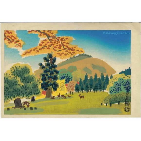 Original woodblock print by Eiichi Kotozuka titled Nara Park In Autumn. Engraved and printed by Uchida Woodblock Printing Company in the 1950s with the Uchida seal and the seal of Kotozuka. The gardens in Nara surrounding the famous Temple with deer grazing on autumn foilage. The print has the signature and seal of the Kotozuka as well as the seal of Uchida. It is in excellent condition apart from some toning which can be seen in the images.