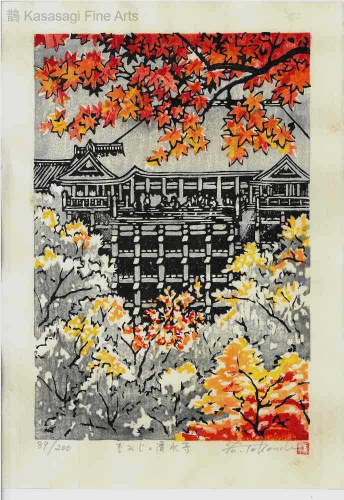 A lifetime edition Woodblock print by Fu Takenaka of the Kiyomizudera Temple In Autumn. The famous Temple in Kyoto during Autumn, resplendent with its colourful autum foilage. This print is numbered 89 of a limited edition of 200. The artists pencil signature and seal are on the print. Approximate dimensions of sheet are 38.5 cm height and 27.5 cm width. The print dimensions are 32 cm height and 22 cm width.