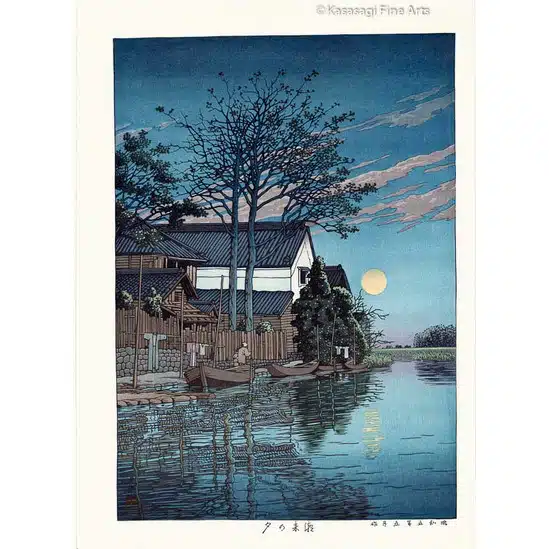 Evening at Itako Woodblock Print is another masterful creation by Hasui. The setting sun casts a soft glow over the rural village of Itako. Images of the sky and landscape are reflected on the twilight waters of the lake as walkers traverse along the river’s edge past kimonos and other attire which are hung out to dry. Originally created in 1930 and signed Hasui with red artist’s seal “Kawase”. This print is a later edition from the original woodblocks by Nakajima and the printer is Numabe.