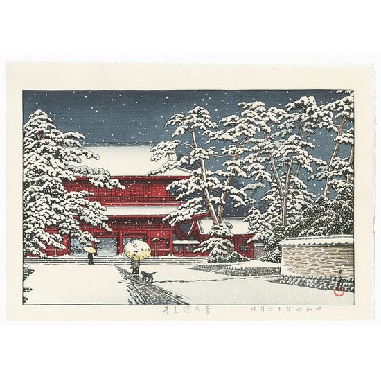 Kasawa Hasui’s famous depiction of Zojoji Temple. A dog accompanied by two people walk the snow laden temple grounds which forms stunning contrast to the red temple.