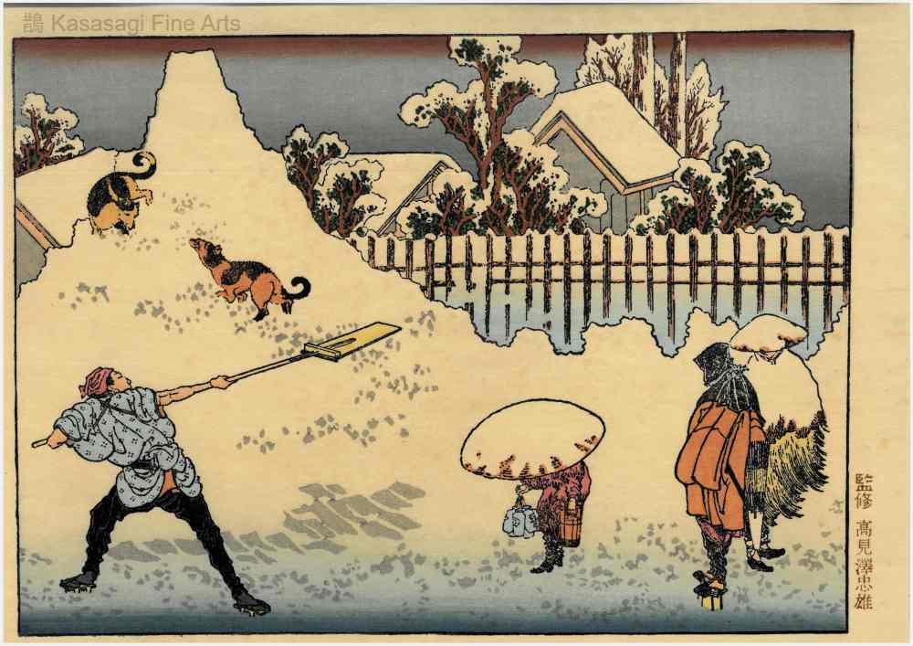 From the Hokusai Anthology of Famous Pictures this woodblock print is titled Morning Downtown After A Heavy Snow. In the mid-1950s, the renowned Takamizawa Publisher released a reprint series of 49 of Hokusai prints including this woodblock print. The series focused on less commonly seen woodblock prints by Hokusai. They included nature scenes, beauties as well as selections from Hokusai’s “100 Views of Mt. Fuji” series. Printed with the attention to detail and exquisite quality of the Takamizawa Publisher.
