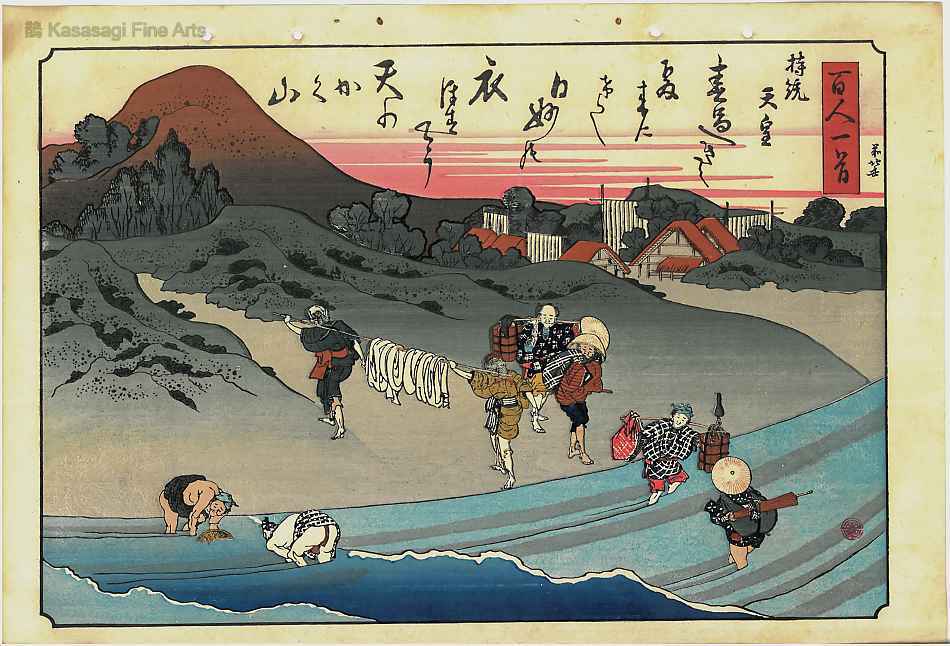 Hokusai Woodblock Print One Hundred Poems for 100 Poets Number 2. An evocative woodblock print by Hokusai with a poem Poem by Jitô Tennô Explained by the Nurse (Hyakunin isshu uba ga etoki). Originally printed between 1835 and 1836. This is a 20th century woodblock reprint in excellent overall condition. Fisherman tending their baskets in the water while travelers lwade through the shallow water carrying parcels and two women carry white fabric draped over a bamboo pole. The poem by the seventh-century Empress Jito reads:
