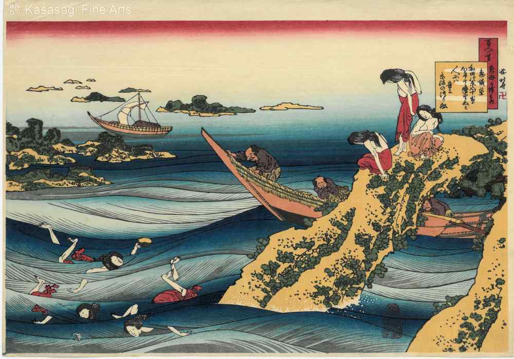 An evocative woodblock print by Hokusai with a poem titled Sanji Takamura (Ono no Takamura) from the series One Hundred Poems By One Hundred Poets Explained by the Nurse (Hyakunin isshu uba ga etoki. A vibrant scene of abalone divers in rugged swells accompanied by fisherman in a boat. Women are depicted swimming among the waves and holding shells, as others take a break on a nearby rock. Originally printed between 1835 and 1836. This is a 20th century woodblock reprint in excellent overall condition. The poem Sangi Takamura a ninth-century advisor to the emperor, reads: