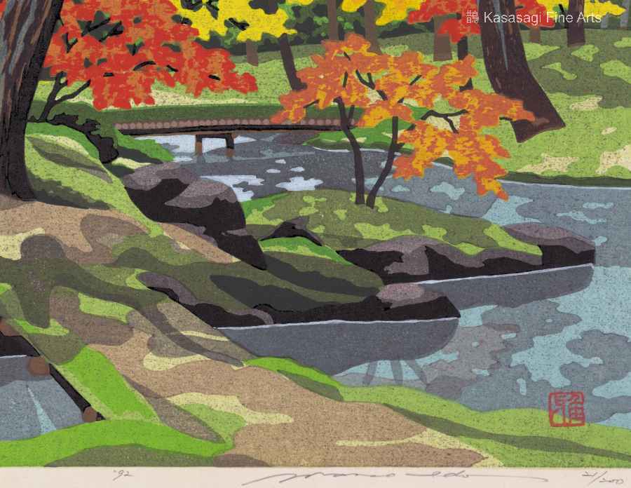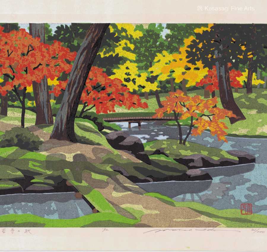 An original 1992 woodblock print by Ido Masao titled “Autumn of Moss Temple”. The print is pencil signed by Masao and bearing his seal. Numbered 21 of a limited edition of 200 woodblock prints with vibrant colours which are unique to Masao and known as IDO Green. The woodblock print is in very good condition.
