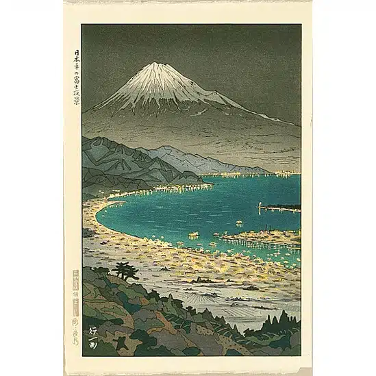 Koichi Okada was a Japanese landscape artist who created a series of woodblock prints of Japan during the late 1940s. Born in Tokyo, Okada studied with Ishii Hakutei and Arishima Ikuma. Okada is best known known for his strikingly detailed woodblock prints landscapes featuring Mount Fuji.