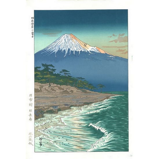 From a series created by Okada called “Twelve Views of Japan” of which 5 are in publication. His woodblock prints depict Mount Fuji each skillfully emphasising the mood of the sacred mountain in various seasons.