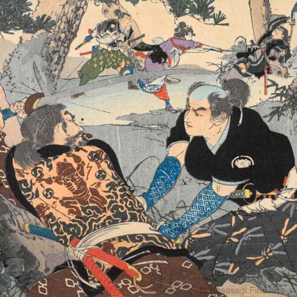 A woodblock print from a pre World War II Japanese Adventure Book. A genuine and original woodblock print on washi paper created between the late 1800s and early 1900s. Specially created as woodblock print covers for romance and adventure novels and books. Silver Mica has been used on the swords.