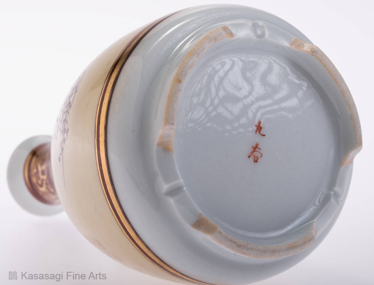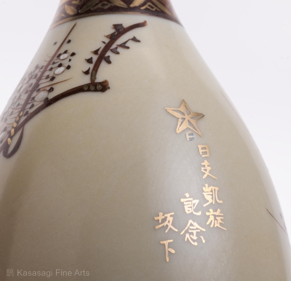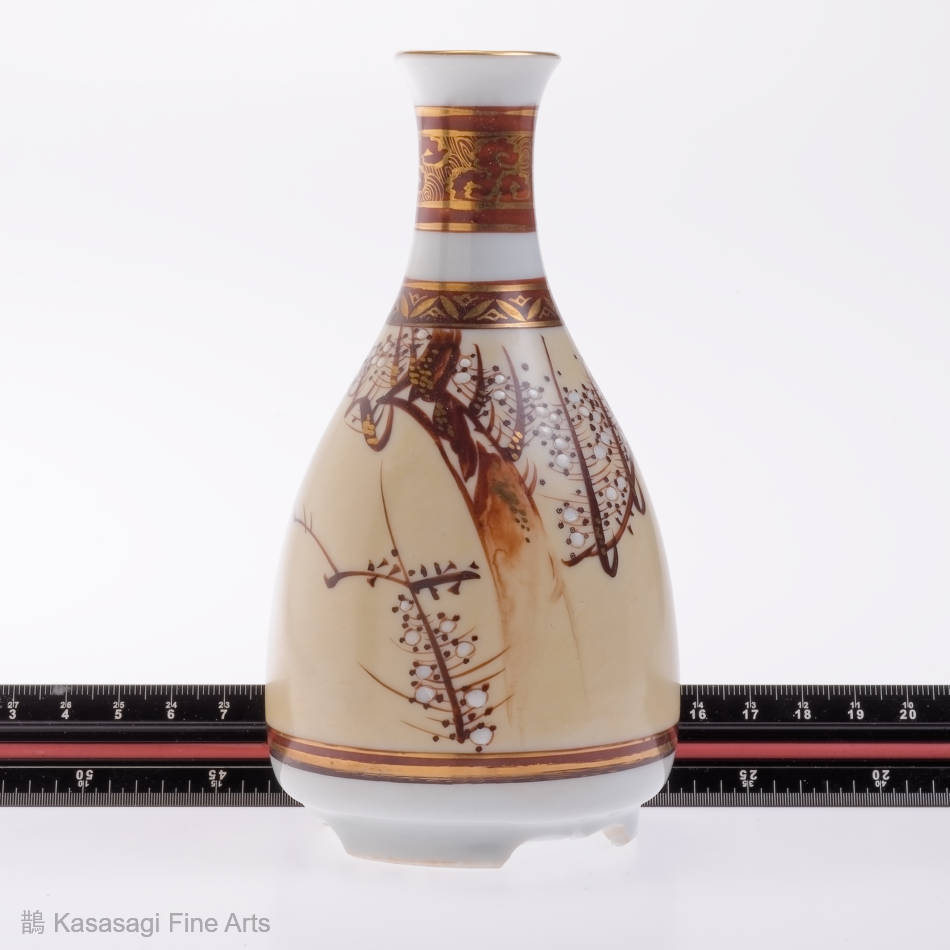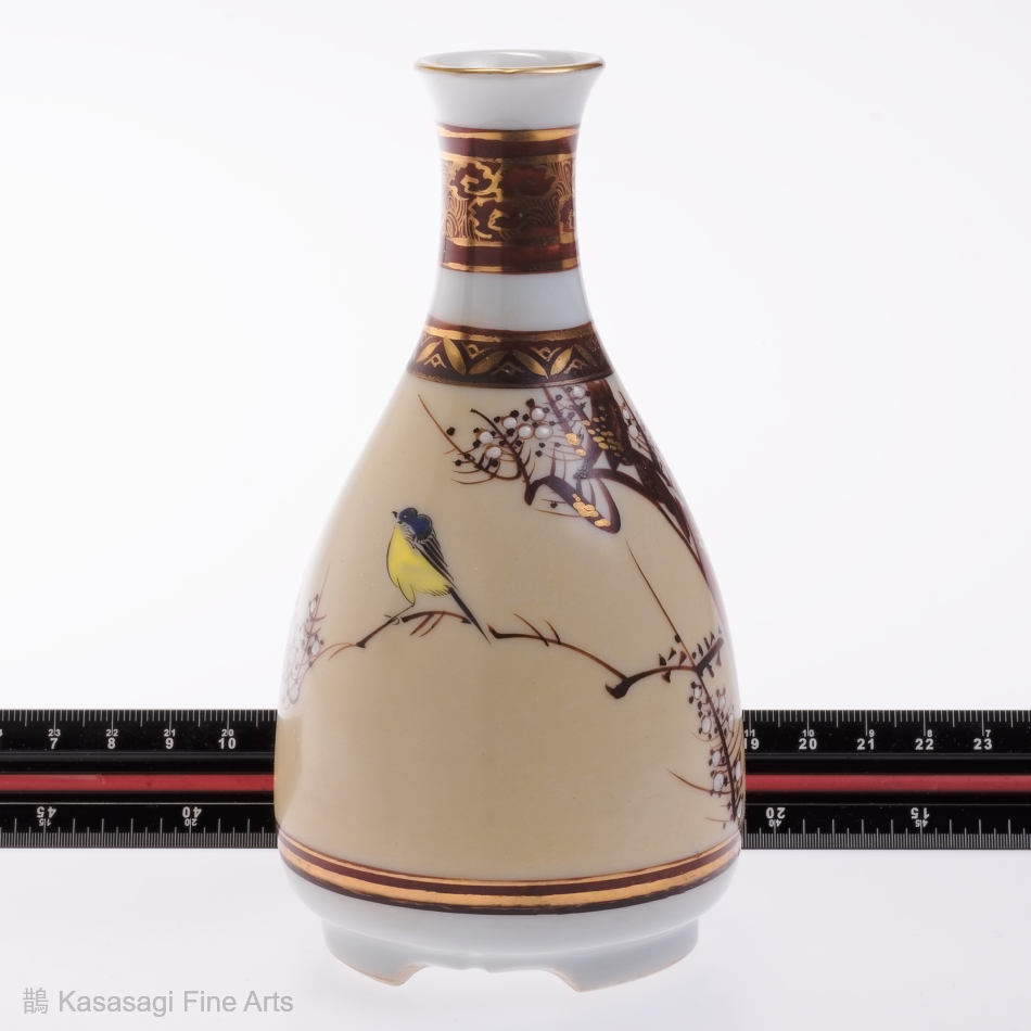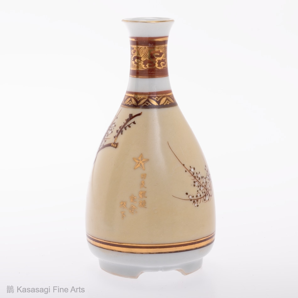 A rare Kutani Tokkuri Japanese Army Sake Bottle from the Second Sino Japan War. Depicting a bird perching on a branch of Japanese apricot (Ume) Bough. The Japanese Imperial Arm Star is hand painted above the words Nisshi Gaisen Kinen (Triumphant return from the 2nd Sino Japanese War with the soldier’s name “Sakashita”. The Kutani signature is featured on the base of the bottle.