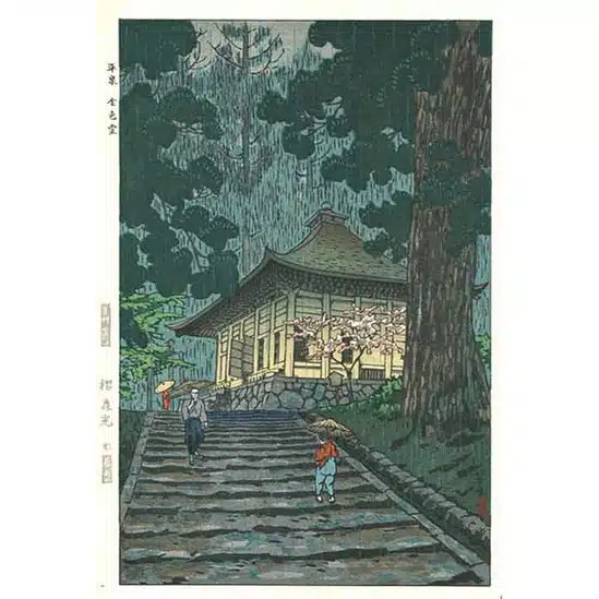 Shiro Kasamatsu Woodblock Print of Konjikido Shrine in the town of Hiraizumi in the Iwate Prefecture of Japan. Like the famous Kinkakuji (Golden Pavilion) in Kyoto, Konjikido is a hall which is also completely covered in gold. It dates back to 1124 and stands inside another building for protection and photography of Konjikido is also prohibited. In excellent as new condition and hand printed on washi, traditional Japanese paper with ink bleed through to the reverse.