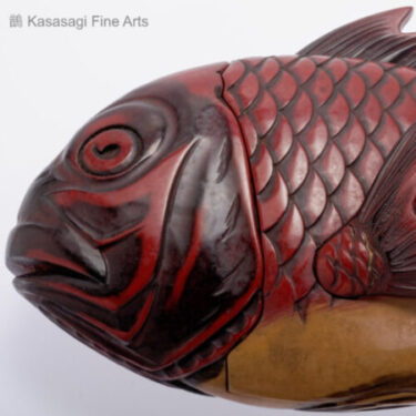 An early 20th Century large Lacquer lidded confectionery box in the shape of a Sea Bream. Finely hand carved in the shape of a yellow bellied red sea bream, a dark red body and black lacquer interior. The scales and fin are beautifully detailed and finished in red lacquer and the tail and fin are also decorative handles.