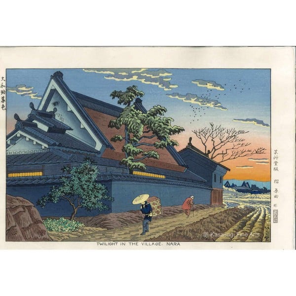 A woodblock print by Takeji Asano depicting a twilight scene in the picturesque village of Nara with an orange hue against a blue sky. Beautifully detailed with stunning colours and contrasts. Originally printed in 1953 this later edition is also printed from the original woodblocks. Asano’s seal in black along with the publishers Seal of Unsodo. The Japanese title is on the left margin and the English title on the bottom.