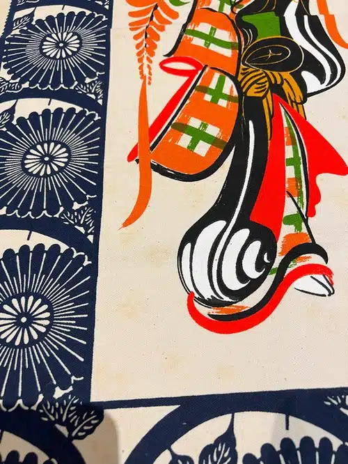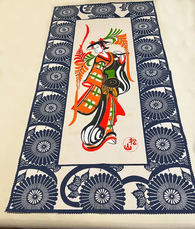 Vintage Artwork of a Fuschia Maiden on Cotton Canvas estimated to be from mid 20th Century. Featuring a striking blue border of chrysanthemums and still retaining the vibrant colours. Measuring 84 cm by 44.5 cm it would look striking framed. Some spotting on centre of image from age and storage add to the integrity of this artwork (see images). Sold as it.