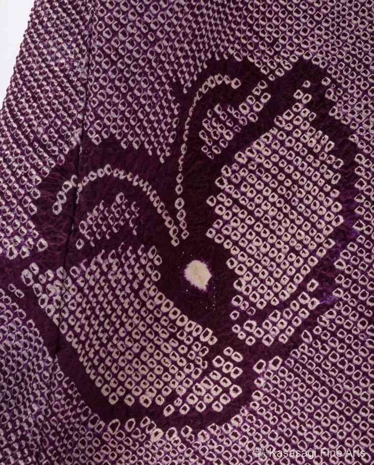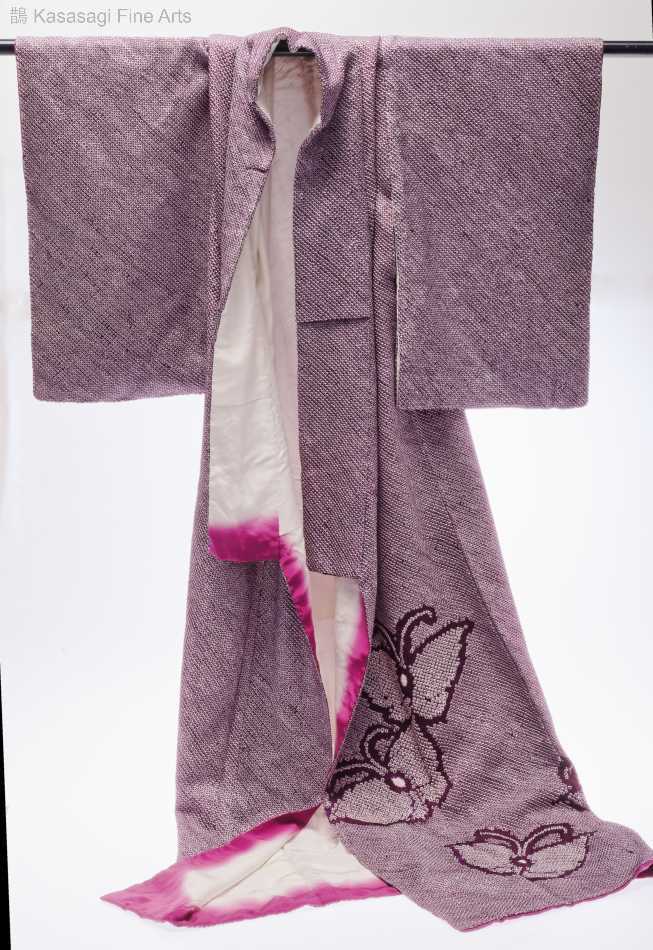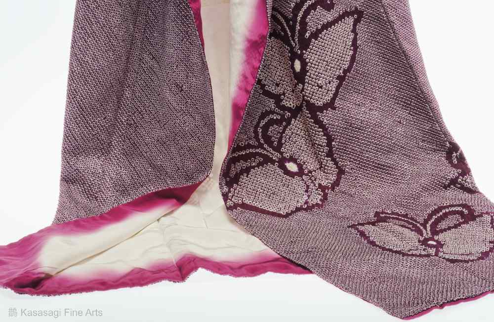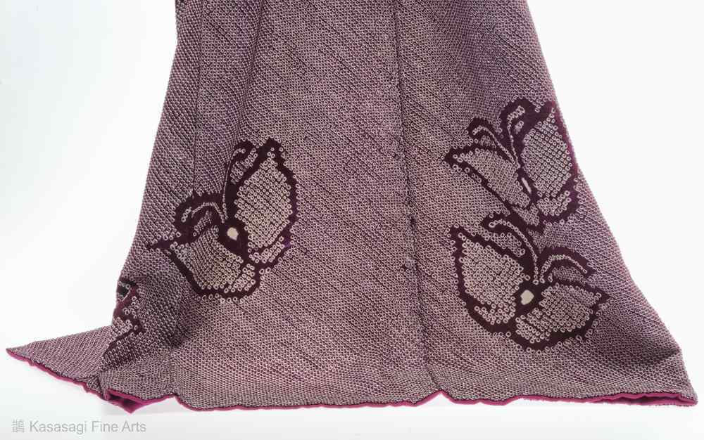 A striking vintage Kimono made from Shibori Silk dyed deep purple with butterflies around the hem of the kimono and silk lined.